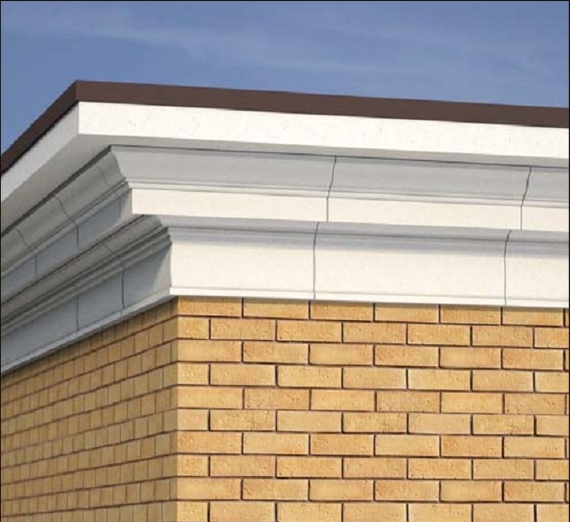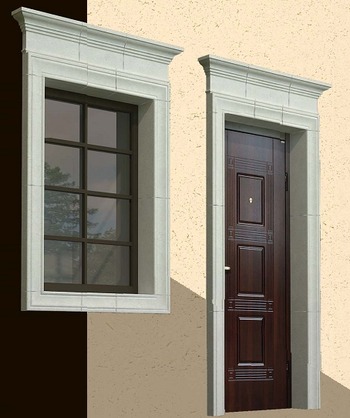 Для декора фасада дачи в Рязанском районе использовались изделия Arhio. Это замковые камни и наличники для создания оконных и дверных обрамлений, серия кронштейнов для оформления верхней части фасада, соединяемой с кровлей, а также карнизы для подчеркивания цокольной части.